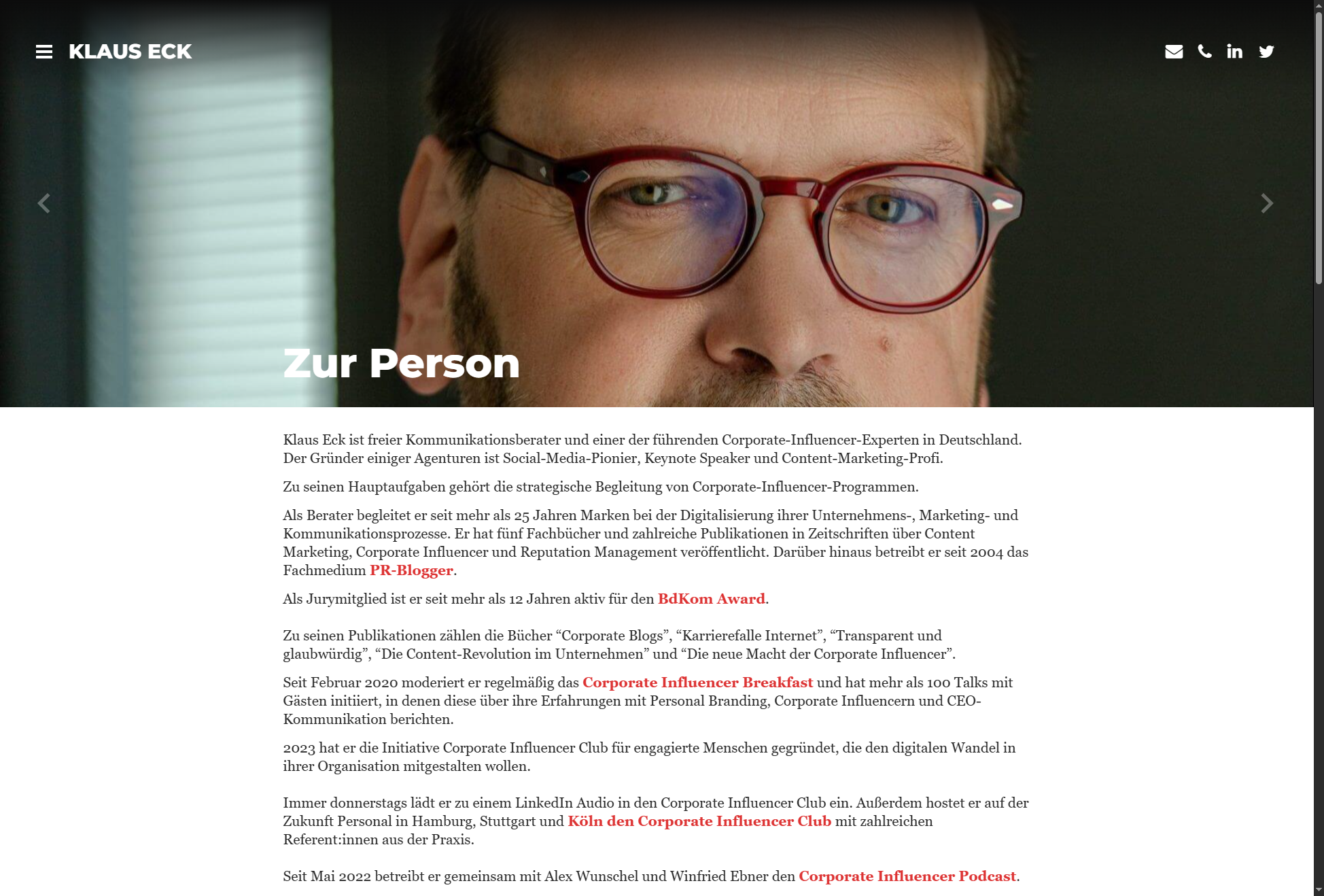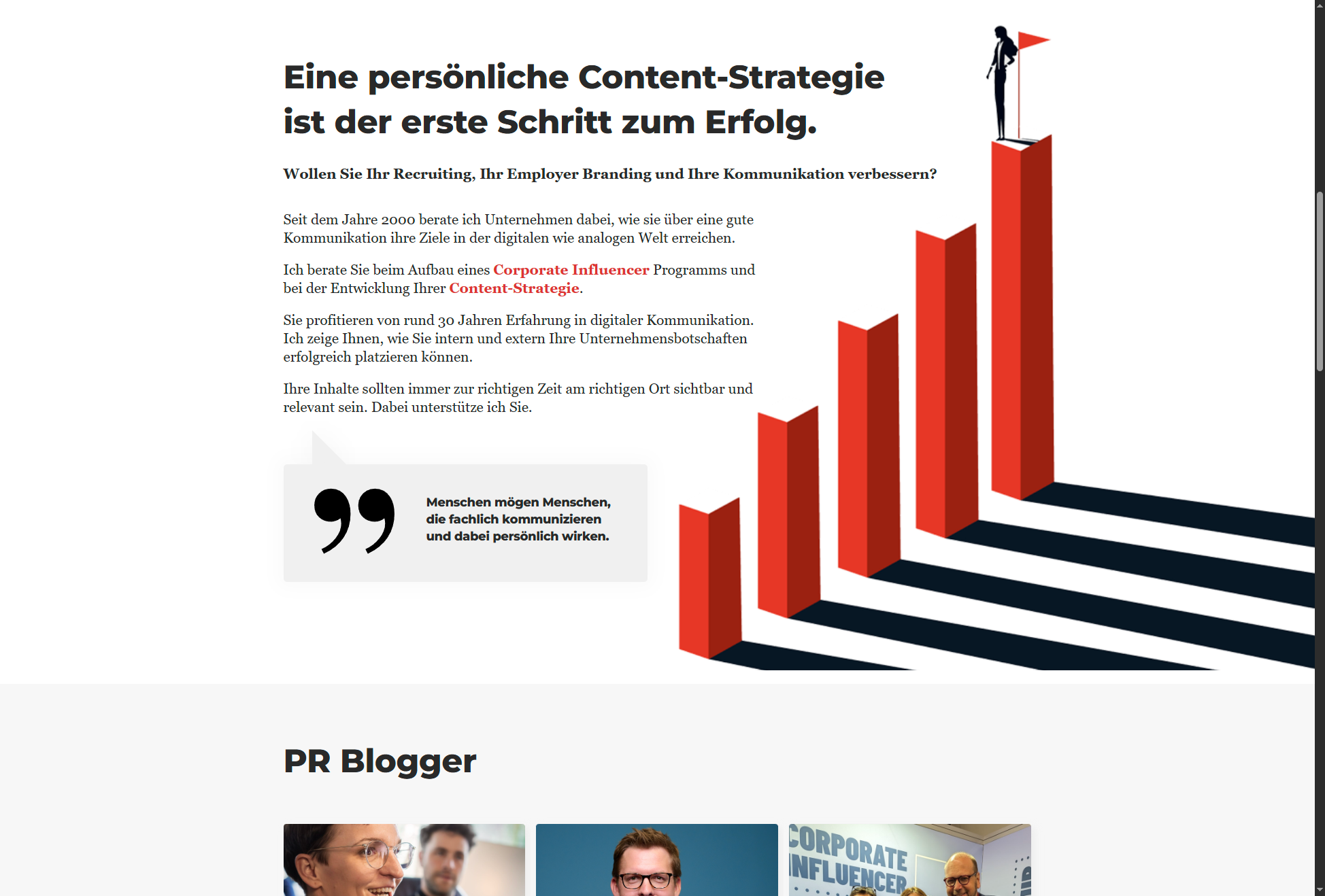 Seine persönliche Website dient nicht nur als ausführliche Visitenkarte, sondern auch als Content-Hub, in dem die neuesten Publikationen des reichweitenstarken PR Bloggers, des Newsletters und diverse Inhalte zum Thema Corporate Influencer automatisiert als Teaser ausgespielt werden. Ein Set an professionellen Pressebildern für Medienschaffende rundet das Angebot ab.