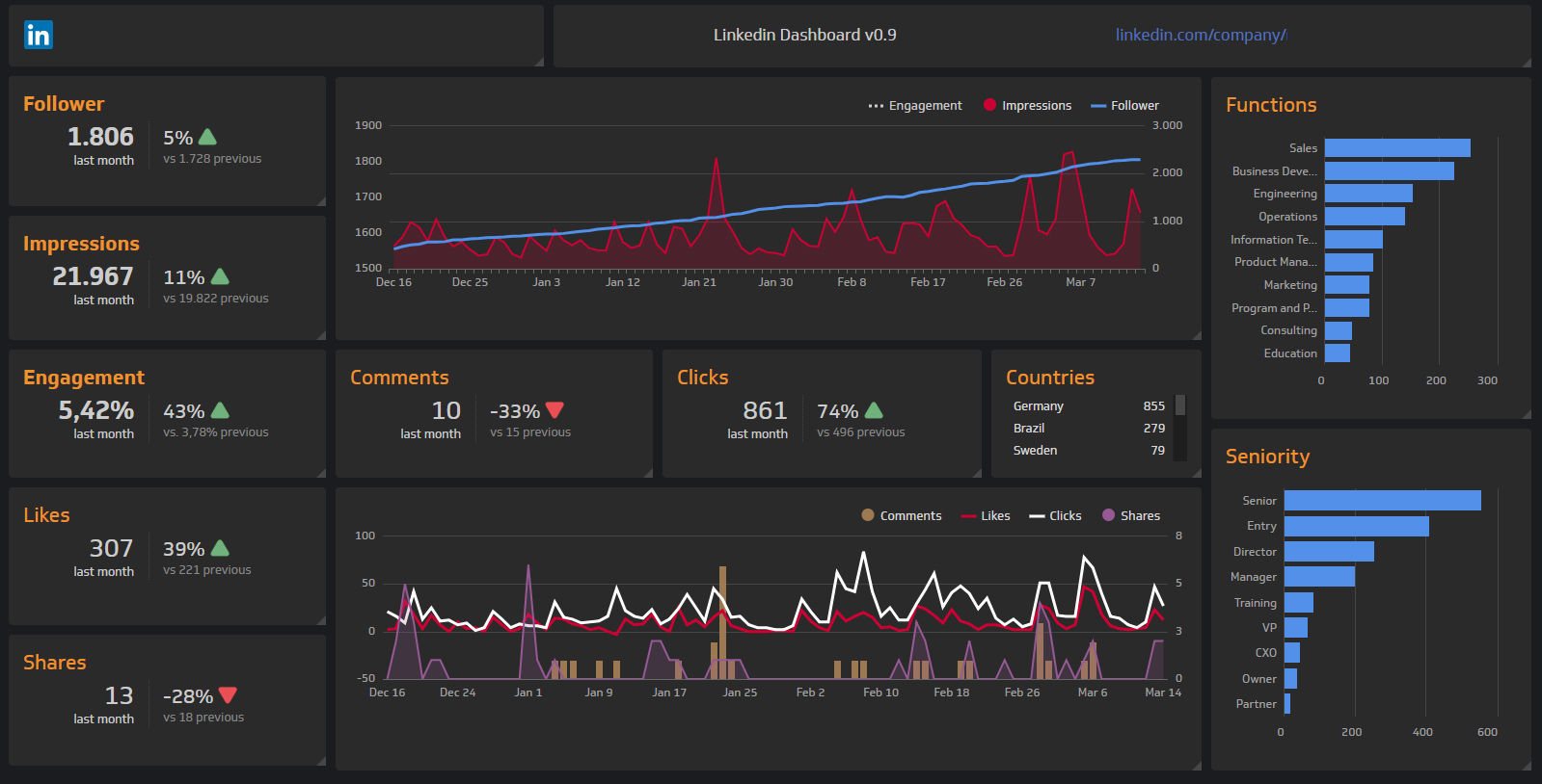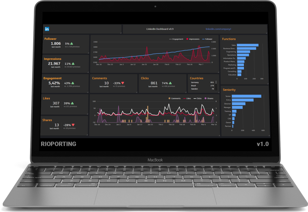 Das Rioporting ist ein Dashboard zur Darstellung von Kennzahlen der Kommunikationskanäle Facebook und LinkedIn, sowie der Website der RIO AG. Die in Echtzeit abgefragten Daten wurden mit Hilfe von Klipfolio aggregiert, gefiltert und gemäß Kundenwunsch visualisiert.